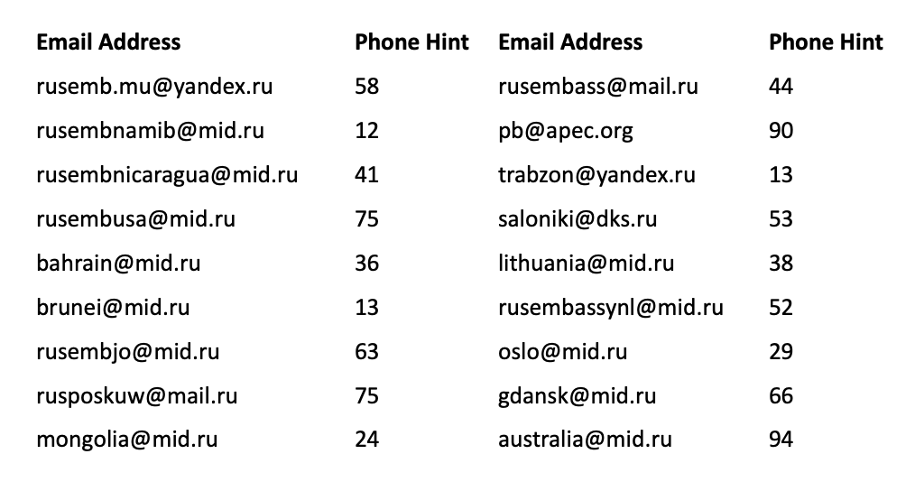 Even worse, many of Russia’s diplomatic emails are flawed from the start: two email addresses are registered with Yahoo, two are registered with Hotmail, fifteen are registered with Gmail, one is registered with MSN, and eighteen are registered with Yandex. Personal email providers like these offer nothing near the level of security required for diplomatic communications.